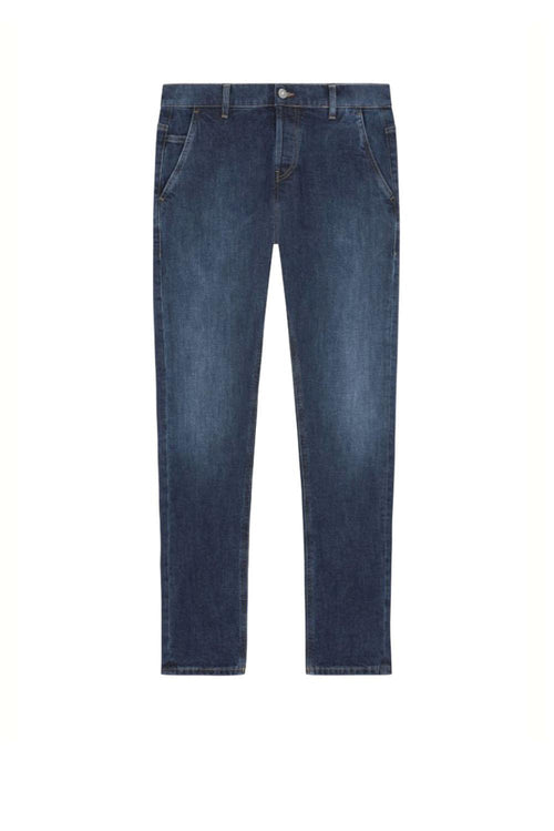 Jeans Konor cinque tasche skinny fit, vita bassa, tasche america. Denim stretch blu 11 1/2 oz. Lavaggio scuro pulito. Logo Dondup. Made in Italy